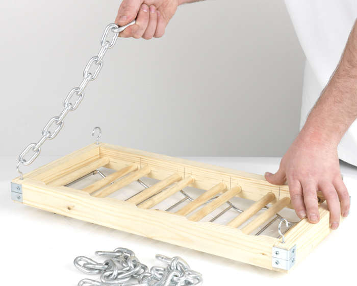 По углам лицевой стороны винной полки привинтите самонарезающие винты. Присоедините к ним металлическую цепь — с ее помощью поместить полку можно будет в любом месте на кухне.