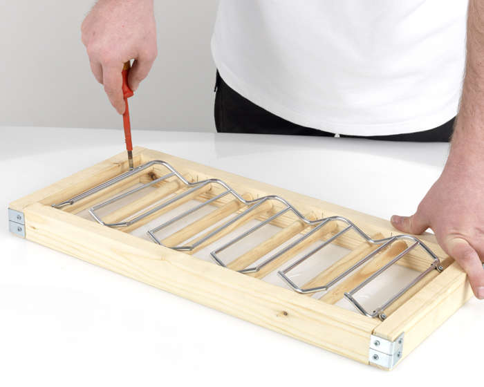 Закрепите рейки в намеченных точках, используя клеевой пистолет Dremel (930). Для завершения работы над полкой осталось лишь cкрепить все её части шурупами. Проделайте отверстия в составных деталях полки и установите в них металлические угловые скобы. Затем ввинтите 25-миллиметровые шурупы и закрутите их отверткой. Чтобы винная полка стала еще удобнее, можете установить на ней решетку для подвешивания бокалов. Для этого понадобится лишь привинтить отверткой металлическую решетку с обратной стороны полки.