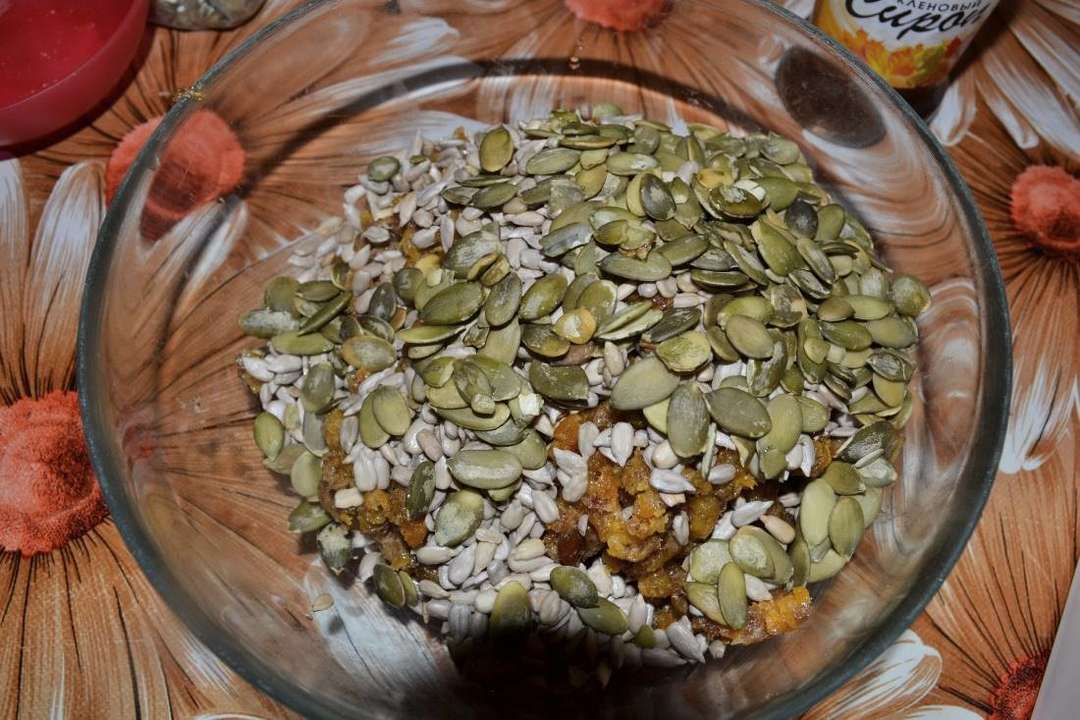 50 г очищенных тыквенных семечек, 50 г очищенных семечек подсолнечника, 50 г семен льна, 100 г кленового сиропа,