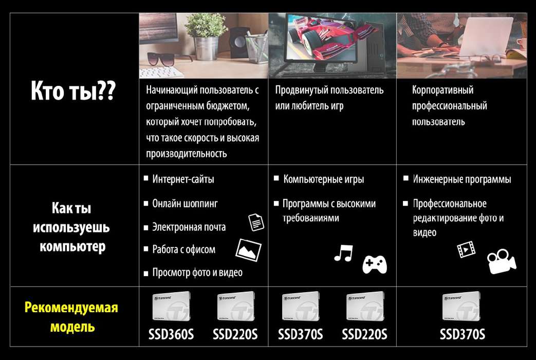 Подобрать твердотельный накопитель Transcend можно по таблице ниже: