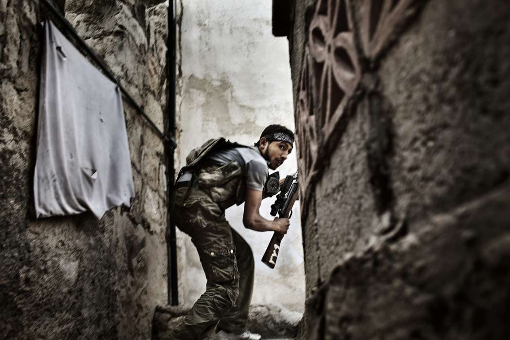 Боец армии освобождения Сирии занимает позицию во время боя против правительственных сил в района Sulemain Halabi.