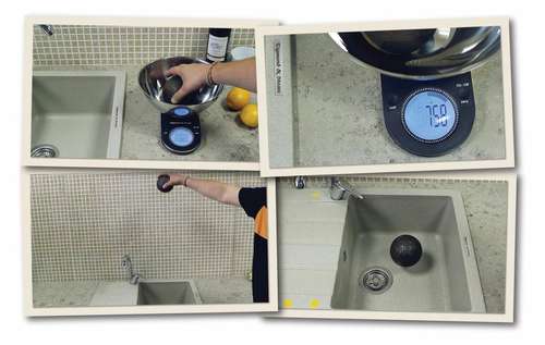 - И, наконец — смертельный номер! Взяли стальной шар весом семьсот шестьдесят грамм. И швырнули его с метровой высоты прямо в мойку. Вы не поверите, но мойка осталась цела. Это показывает, что вы смело, можете ронять в неё любую посуду и кухонные аксессуары.