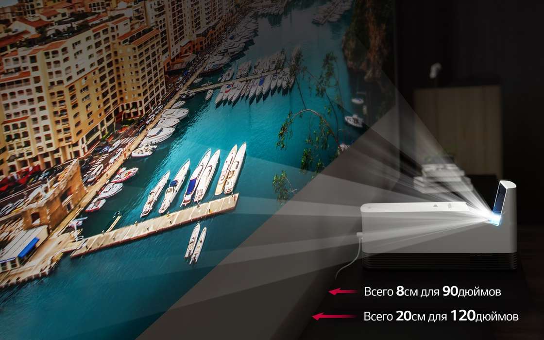 Ультракороткий фокус проектора LG HF85LSR с яркостью 1500 Люмен обеспечивает изображение диагональю 90" при установке проектора всего в 8 см от стены.