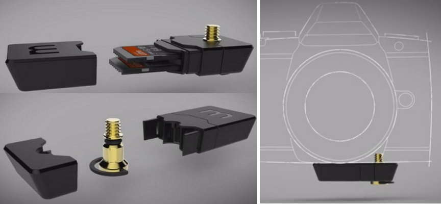 Идея, лежащая в основе Memistore, заключается в том, что, в отличие от кейса для карт памяти, который легко потерять, свою камеру вы всегда кладёте на место и знаете, где она находится. Таким образом, у вас под рукой всегда есть две запасные карты, надежно размещенные в защищенном от брызг жестком футляре. Штатив и башмак- стандартные места крепления Memistore, однако на стадии разработки находится адаптер и для обуви.