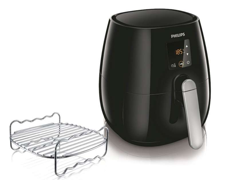 Модель HD9235, выполненная в черном цвете, укомплектована специальной решеткой, на которой можно запекать и обжаривать вкусные шашлычки, бургеры, пиццу, куриные крылышки, рыбу и многое другое.