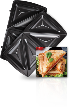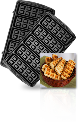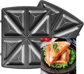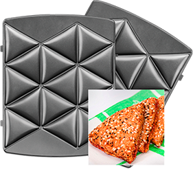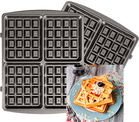 Мультипекарь позволяет сделать 4 пышные вафли, 8 горячих треугольных сэндвичей или 12 печений курабье.