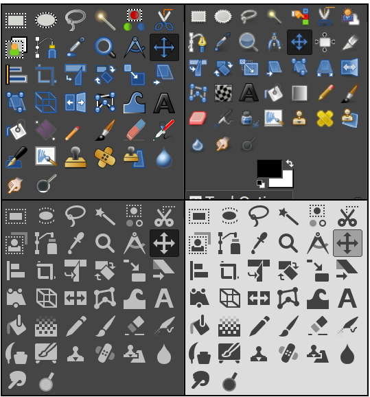 Также новый движок привносит в GIMP 2.10 обновленный пользовательский интерфейс с новой темной темой и тёмными иконками символов, которые включены по умолчанию. Пользователям в общей сложности доступно четыре варианта темы: Dark, Light, Gray, and System. Тем не менее, иконки отделены от тем и пользователи могут выбирать их независимо друг от друга, для настройки темы с цветными значками
