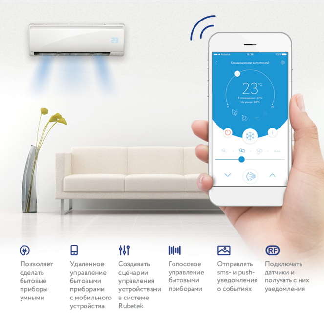 Благодаря успешной интеграции мобильного приложения Rubetek и системы HomeKit, можно управлять кондиционером, конвектором или увлажнителем воздуха, используя голосовые команды. Для этого необходим iOS-девайс и голосовое помощник Siri. Пользователи Android-устройств тоже могут управлять электроприборами голосом благодаря мобильному приложению Rubetek.