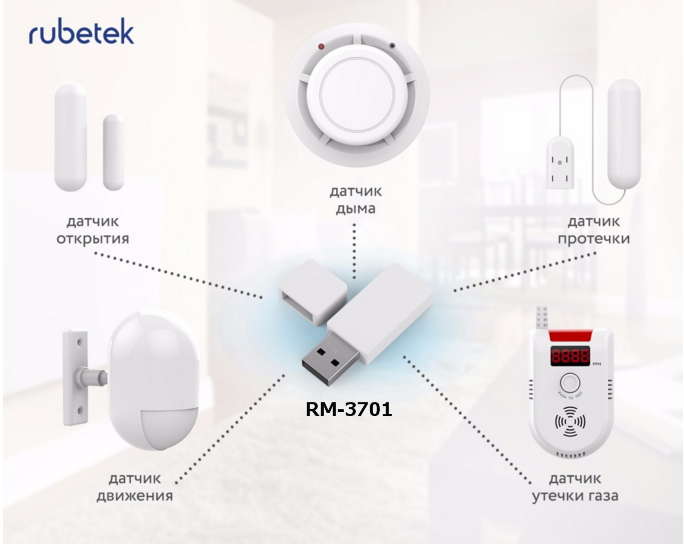 Модуль управления можно подключить через USB-адаптер к сети 220В, и он будет функционировать, как центр умного дома. Модуль управления позволяет подключать внешние датчики (движения, открытия, протечки воды, утечки газа и дыма) по RF-частоте (433 МГц) и создавать сценарии взаимодействия между подключенными устройствами. Для создания более сложных сценариев необходимо приобрести Центр управления Rubetek.