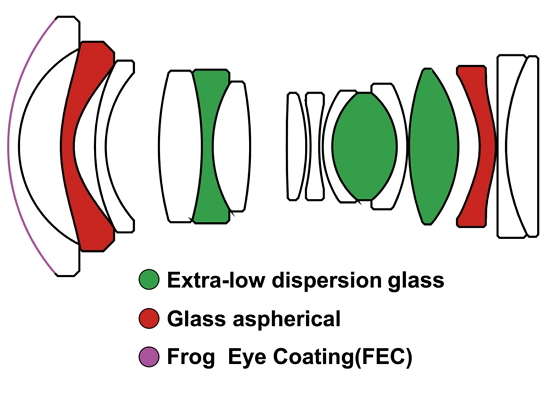 15 элементов в 10 группах 2 асферических элемента 3 низкодисперсных элемента |
