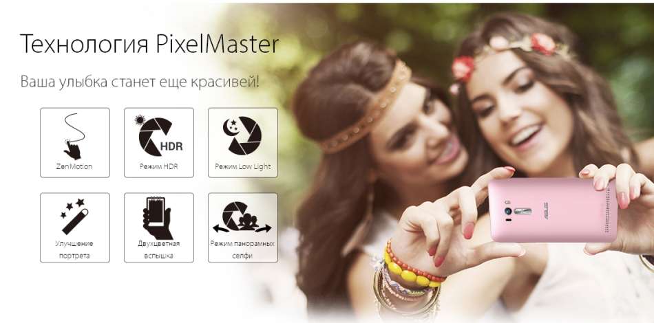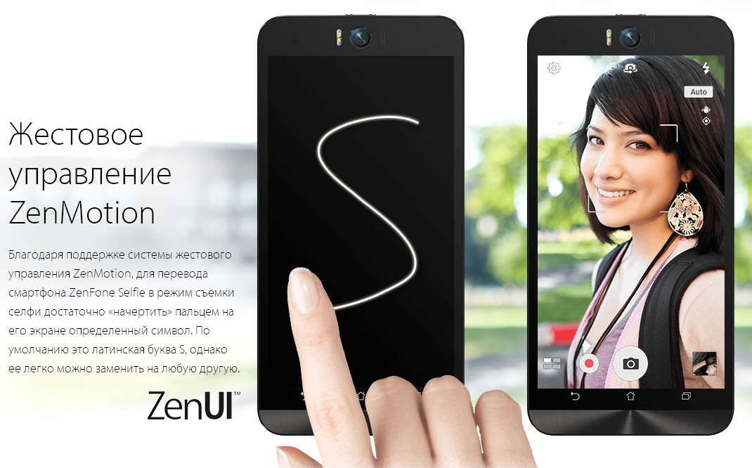 Новый смартфон ASUS ZenFone Selfie, созданный специально для поклонников селфи, позволит делать яркие и четкие фотографии с помощью фронтальной камеры с технологией PixelMaster и светосильным объективом (F/2,2). Благодаря поддержке системы жестового управления ZenMotion для перевода смартфона ZenFone Selfie в режим съемки селфи достаточно «начертить» пальцем на его экране латинскую букву S.