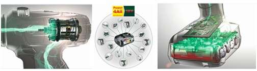 Все инструменты системы Power4all 18V от Bosch Green оснащены литий-ионными аккумуляторами последнего поколения. На сегодняшний день данные батареи самые распространенные, легкие и экономичные среди всех аккумуляторов, использующихся в электроинструменте и бытовой технике. Литий-ионные аккумуляторы выгодно отличаются своей мощностью, весом и компактностью, они постоянно готовы к работе, и их можно подзаряжать в любое время, независимо от текущего уровня заряда. А с октября 2015 года их емкость увеличилась на 20 % (до 2,5 А*ч) — теперь за те же деньги вы можете приобрести инструменты с более емкими аккумуляторами!