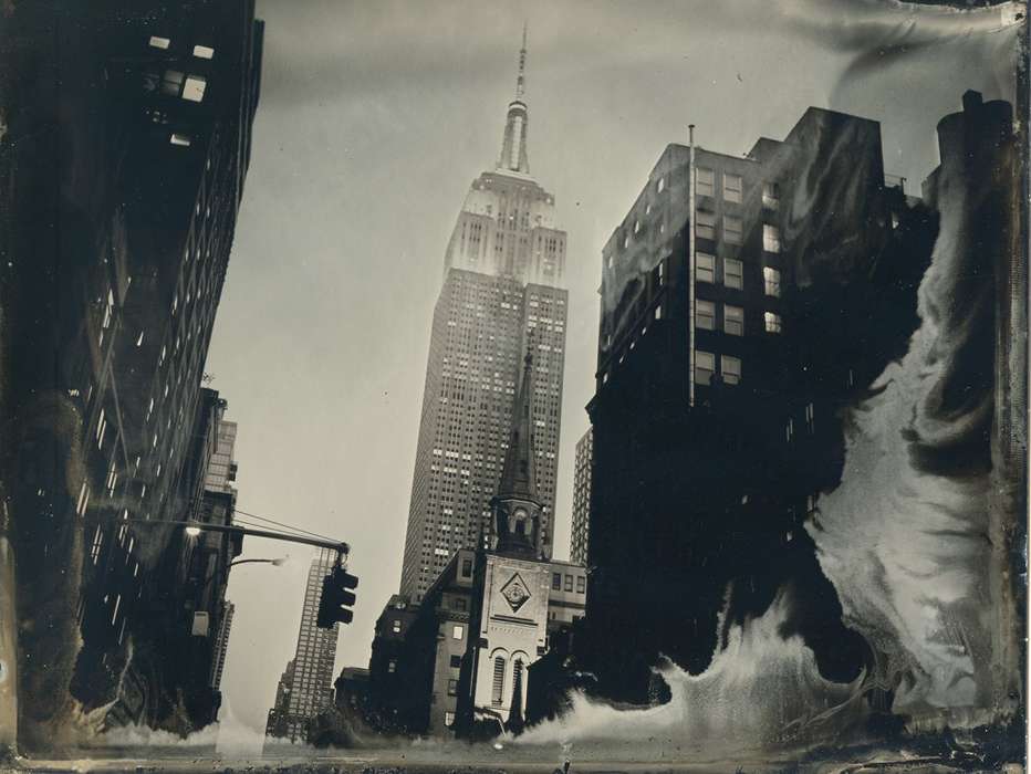 Недавно я собрал пинхольную камеру 8×10”, используя картонную коробку, клейкую ленту, чёрную краску и объектив Coke с изменяемой диафрагмой. Фотография была сделана в период «Magic 15» - время, когда свет на Эмпайр-Стейт-Билде отражается после захода солнца, но при этом имеется достаточно синего света, чтобы выделить фон и окружающие здания. Изображение я проявил в своём автомобие, а затем промыл в мойке, когда приехал домой»