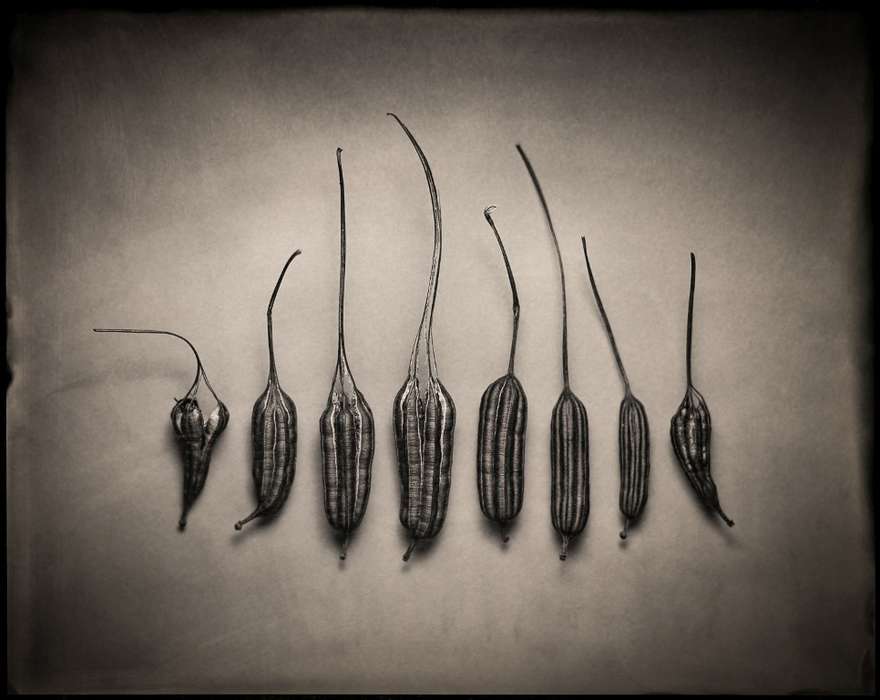 «Эта фотография на мокрой пластине была сделана в импровизированной студии у меня дома. Я скомпоновал отобранные семенные капсулы на темно-сером бесшовном бумажном фоне, закрепив их с помощью маскировочной ленты. Сцена была освещена компактным флуоресцентным софтбоксом сверху и парой заполняющих отражателей снизу. Флуоресцентные лампы обеспечивали достаточное количество света, чтобы позволить мне снять эту сцену на диафрагме f11, используя объектив Schneider Symmar-S240 мм. Эмульсия на основе коллодия была сделана по одному старому рецепту, которой является хорошей рабочей лошадкой»