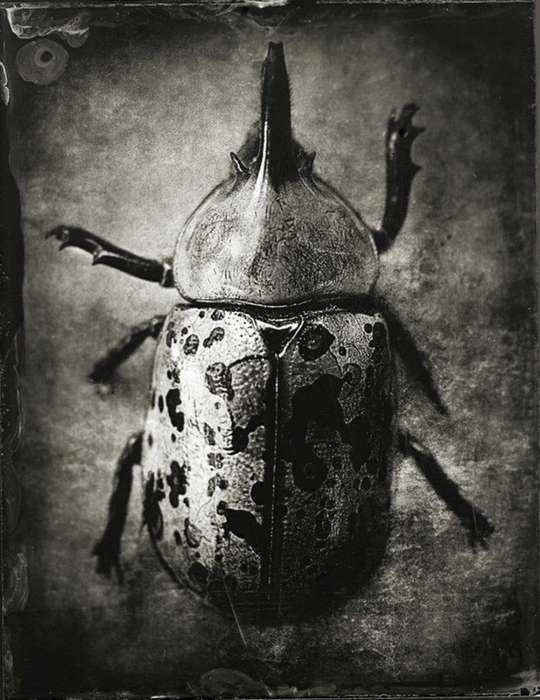«Я работал над проектом под названием «Органика», снимал найденную флору и наткнулся на этого маленького жемчужного жука-носорога. У меня было мало опыта по работе с коллодием, но у меня была соответствующая камера, и много стекла. По счастливой случайности, используя объектив "coke-bottle" и достаточно длинный сильфон, мне удалось получить хорошее увеличение. После нескольких попыток я достиг успеха, и этот прекрасный экземпляр сохранился навсегда. Спустя некоторое время я выставлял свои работы из серии «Органики» в отдельной экспозиции на одной из выставок. К сожалению, в последний день шоу кто-то сорвал жука со стены, и с тех пор его никто не видел»