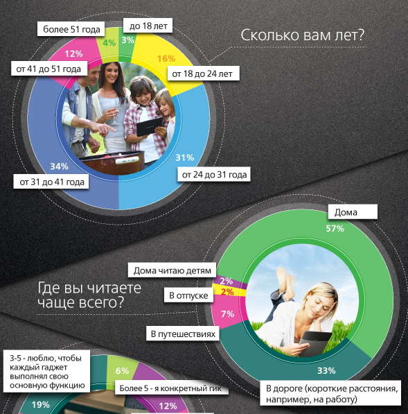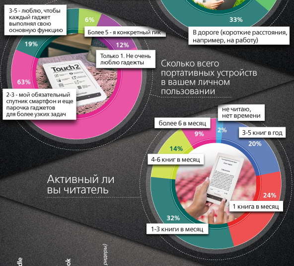 В ходе опроса также выяснилось, что подавляющее большинство опрошенных владеют 2-3 мобильными гаджетами, среди которых преобладают смартфоны, планшеты и прочие устройства для чтения.