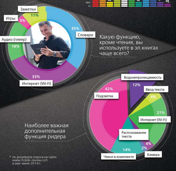 Одной из целей опроса было также узнать, какие дополнительные функции ридеров привлекают читателей. Выяснилось, что самая востребованная –встроенные сло-вари, которые выбрало 35%. А 33% читателей хотят при помощи ридера выходить в интернет. Третье место (18% опрошенных) отдали предпочтение встроенному аудиоплееру. А вот к играм читатели оказались совсем равнодушны: интерес к ним проявили чуть более 3% опрошенных.