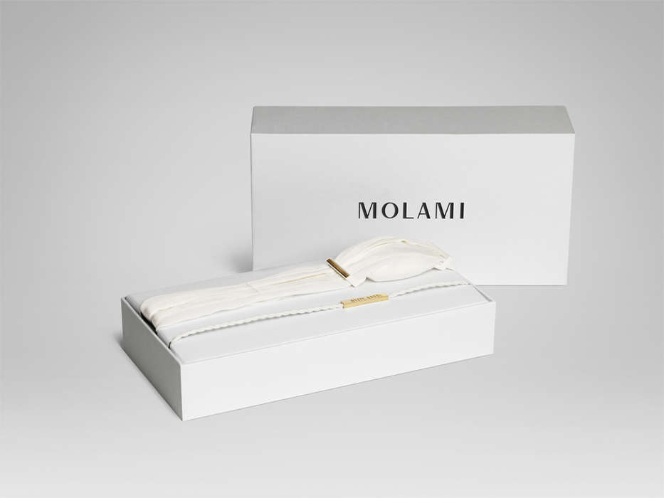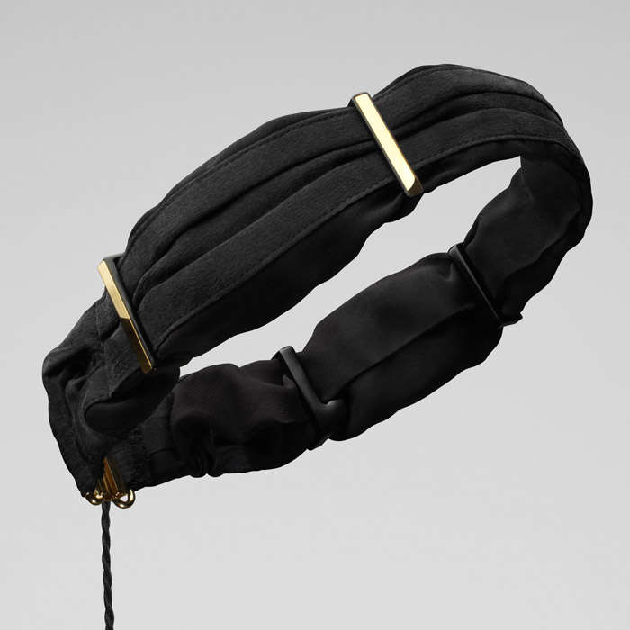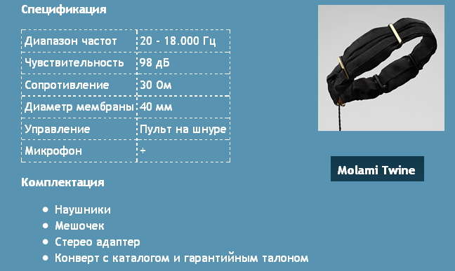 Наушники Molami Twine, выполненные в виде головной повязки, имеют скрытые в слоях шелковой ткани чашки и закреплены золотистыми скобами с функцией регуляции размера оголовья. Такая конструкция дает им хорошую фиксацию. Звукопроводящая конструкция легко вынимается, благодаря чему саму повязку можно мыть. Модель выпускается в черном и белом цветах.