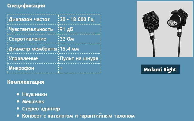 Все наушники оснащены гарнитурой с пультом управления на проводе. Прочный витой шнур заканчивается позолоченным штекером. Частотный диапазон у всех моделей 20-18000Гц.