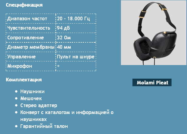 Последняя новинка, Molami Pleat, обладает безупречным звуком: басы передаются очень качественно, а средние и высокие частоты звучат естественно и ясно. Molami Pleat подходит для ношения как в шумном общественном месте, так и дома: благодаря амбушюрам из кожи наушники мягко облегают голову, а также имеют отличную шумоизоляцию. Модель имеет складную конструкцию, поэтому легко помещается в дамскую сумочку. Нау3шники Molami Pleat доступны в черном и белом цветах.