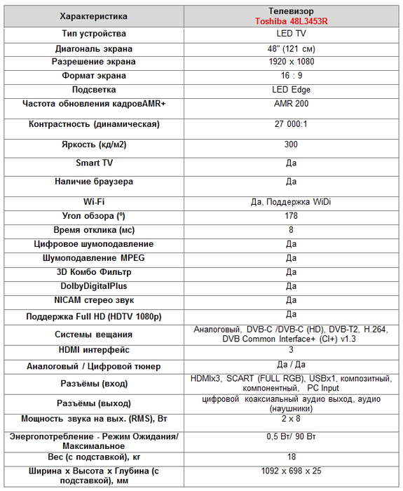 Москва, 25 апреля 2014г. — Компания Toshiba представила на российском рынке новую 48-дюймовую модель телевизора серии L3. В ряду устройств данной линейки новинку выделяет более тонкий и элегантный дизайн корпуса, который был создан без ущерба для функциональности. Превосходное качество изображения на Full HD экране размером 121 см, наличие Smart TV, встроенный Wi-Fi адаптер с поддержкой WiDi, многоканальная аудиосистема Dolby Digital Plus и другие опции, которые делают новинку достойным претендентом на звание центра домашней киновселенной.