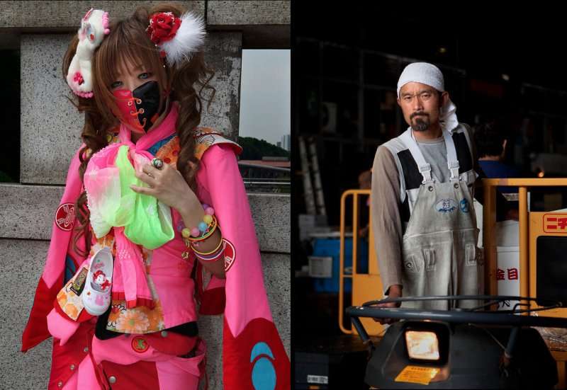 Контрастность современного Токио воплощена и в его жителях. Испанец Карлос Эсколастико в серии двойных портретов сопоставляет два абсолютно разных мира: простых рабочих токийского рынка и японских модниц, чьи экстравагантные наряды часто мелькают на улицах столицы. Фотограф Ацуко Наганума несколько лет посвятила проекту «Bug Train», занимаясь скрытой съемкой пассажиров токийского метро, самого загруженного в мире.