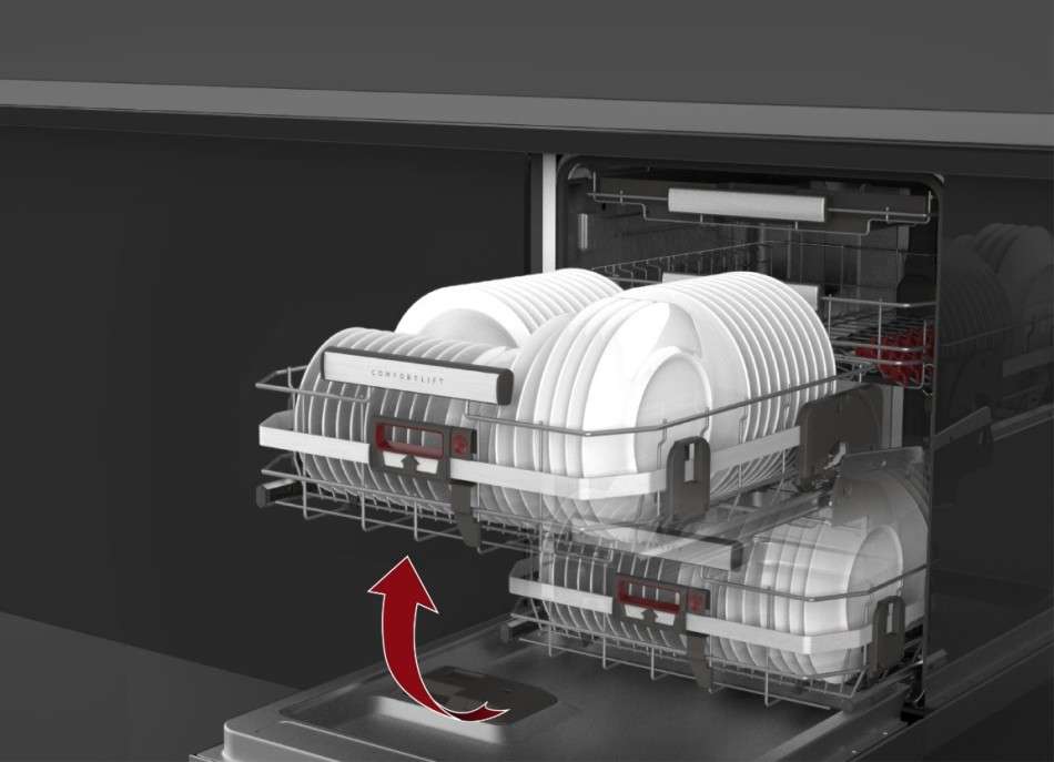 Посудомоечная машина ComfortLift является важнейшей инновацией и первой в своем роде. Уникальный механизм подъема позволяет легко поднять нижнюю корзину на уровень верхней, чтобы посудомоечную машину было легче загружать и разгружать посуду.