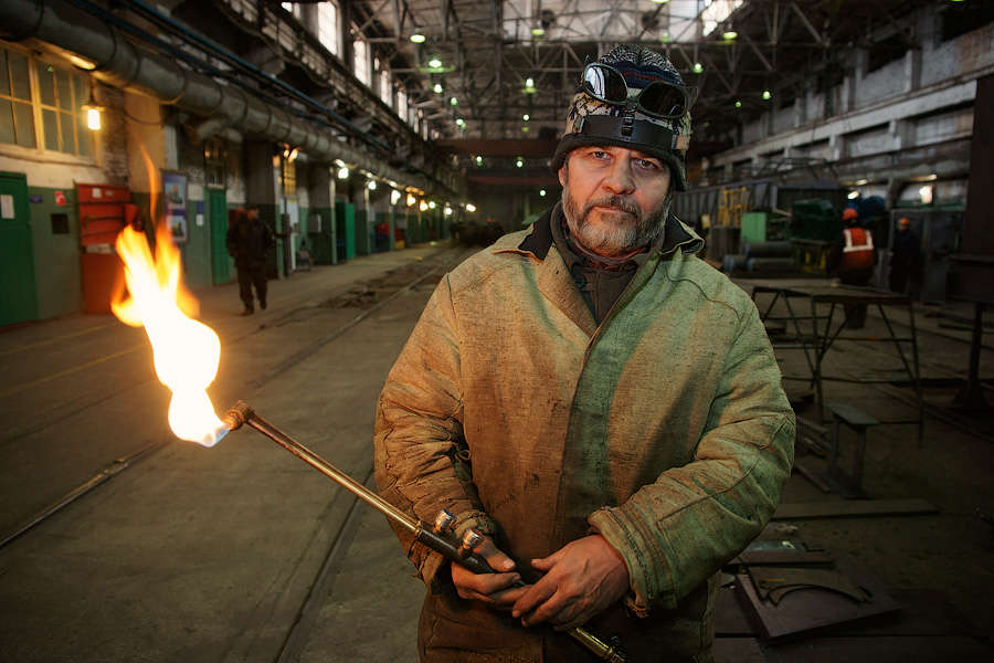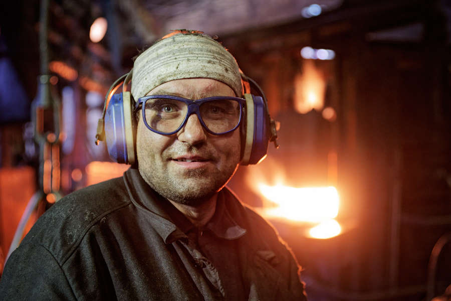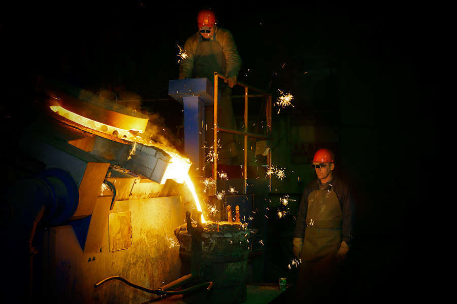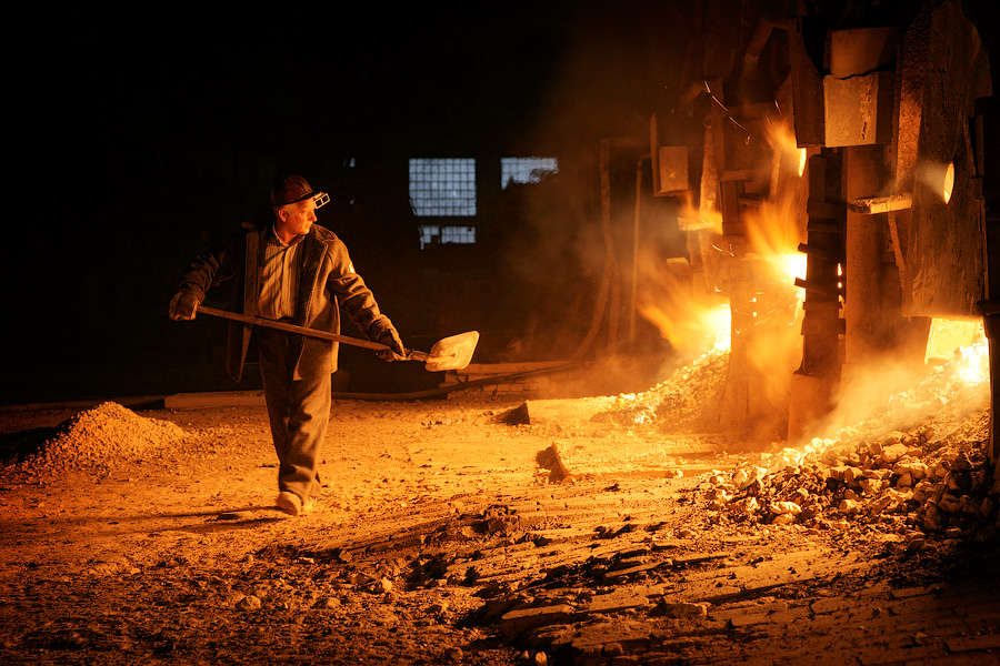 «До поездки я не знал и не нашел информации, как снимать яркую жидкую сталь в сталелитейных цехах, пришлось учиться на ходу. И еще было технически сложно фотографировать в кузнечных и мартеновском цехах – темное помещение, яркие, как солнце, топки печей, вырывающийся из них огонь. Но результат меня порадовал, и кадр со сталеваром у мартеновской печи стал одним из моих любимых в заводской серии», – рассказывает фотограф.