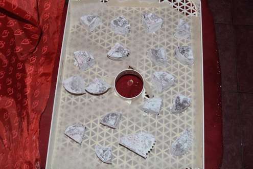 Застывшее желе режем, обсыпаем картофельным крахмалом и укладываем на застеленный пергаментом лоток дегидратора.