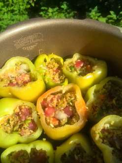 Можно готовить и с рисом, и с мясом, и с грибочками. Да и фаршировать можно и помидоры, и кабачки, и баклажаны. Начинка из булгура — пшеничной крупы — кажется мне более изысканной и нетривиальной. В мультиварке блюдо готовится как в печке, все пропитывается соками и ароматами, а если дать ее постоять в чаше с закрытой крышкой, то становится еще насыщеннее и вкуснее.