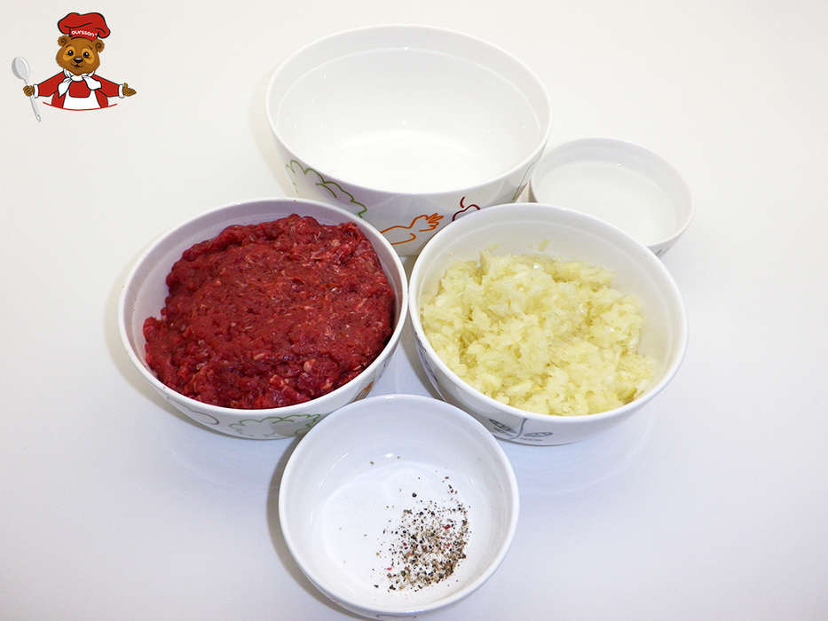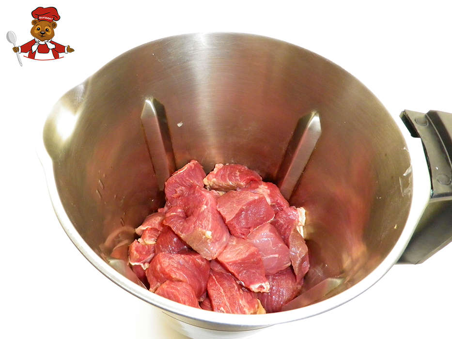 4. Порежьте говядину кусочками массой 30 г и поместите в миксерную чашу. Приготовьте фарш в режиме "Блендер", скорость — 5, время — 30 секунд.