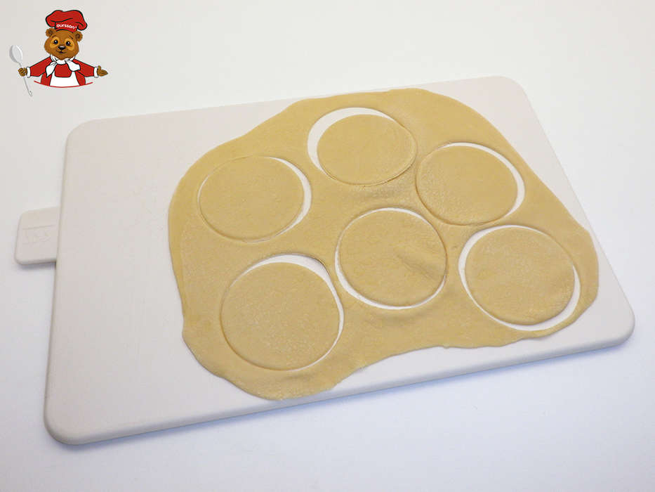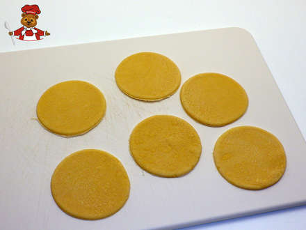 6. Раскатайте тесто в тонкий пласт и вырежьте кружочки при помощи стакана из тонкого стекла.![]()
