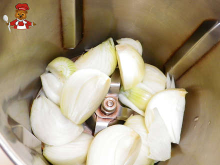 3. Порежьте крупно репчатый лук, чеснок пропустите через пресс и измельчите в режиме "Блендер", скорость — 5, время — 15 секунд. Переложите лук и чеснок в миску.