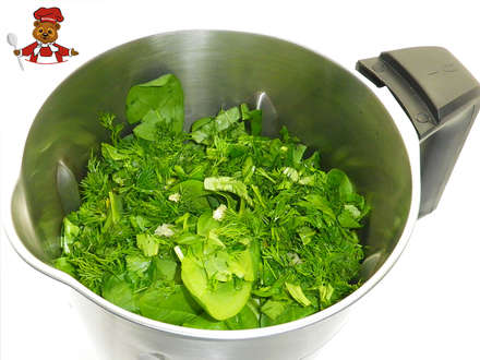 6. Добавьте мелко нарезанную зелень, измельчённый чеснок, влейте сливки и в режиме "Блендер" взбейте суп в пюре. Скорость — 5, время — 1 минута.