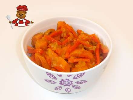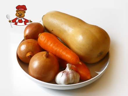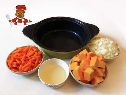 1. Порежьте лук и чеснок мелко, морковь порежьте соломкой, тыкву — крупными кубиками.