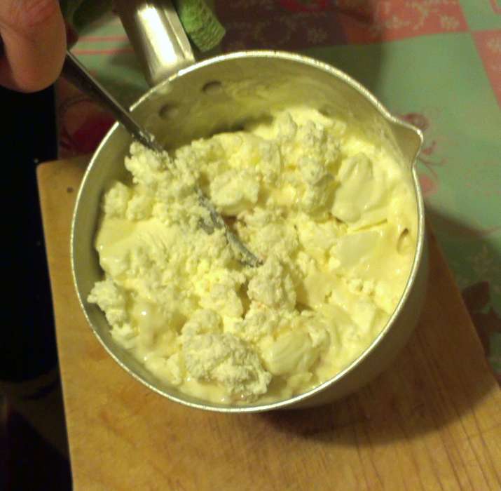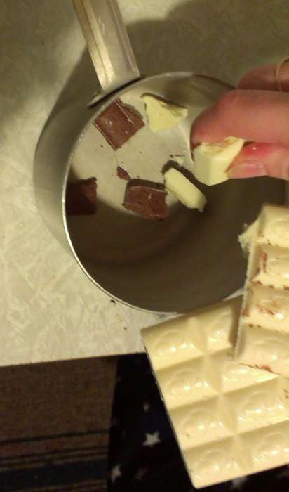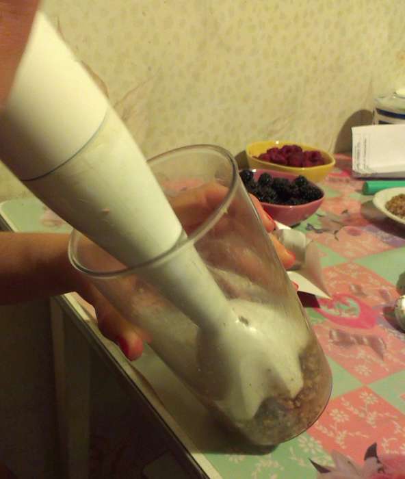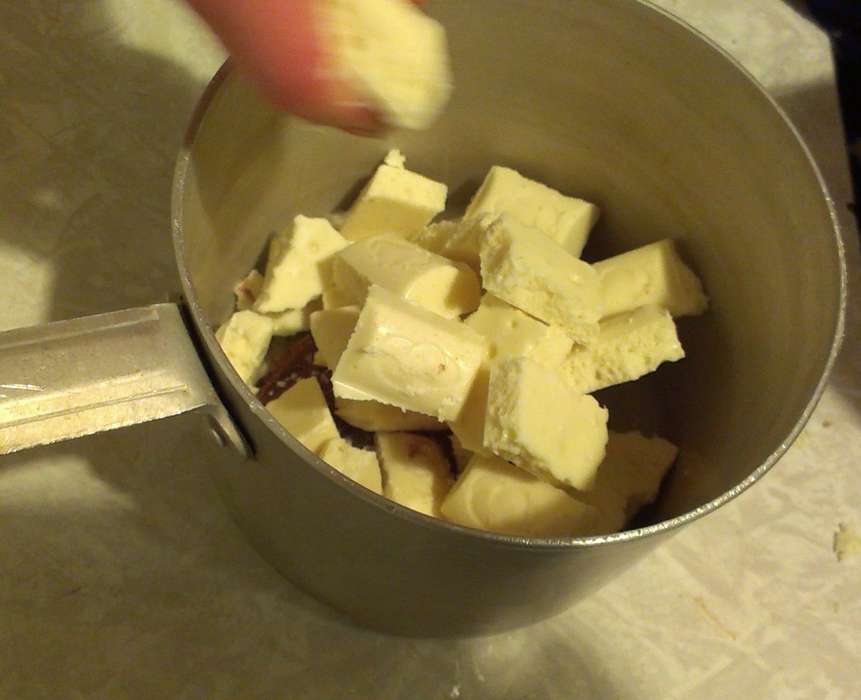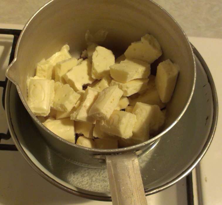 Шоколад растапливаем на водяной бане, смешиваем его с сыром маскарпоне, добавляем ложку какао. Остывшей грильяж ломаем и измельчаем в блендере.