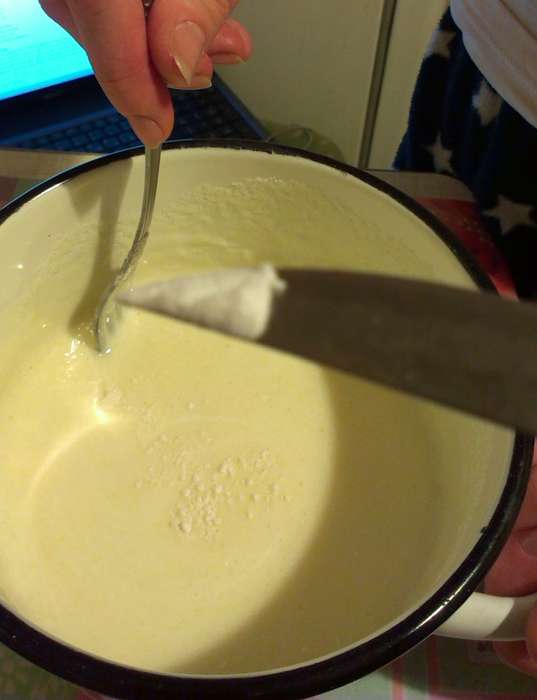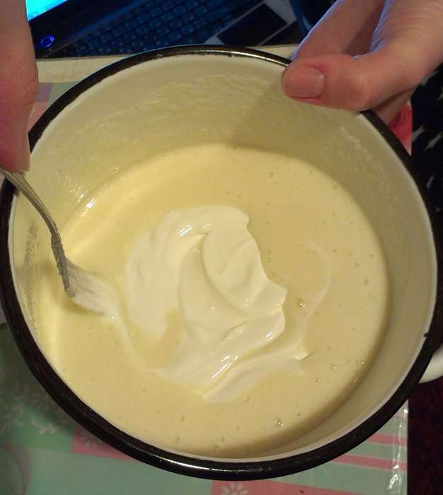 Для приготовления бисквита взбиваем яйца с сахаром, добавляем сметану и муку, тщательно перемешиваем, на кончике ножа добавляем соду и щепотку соли.