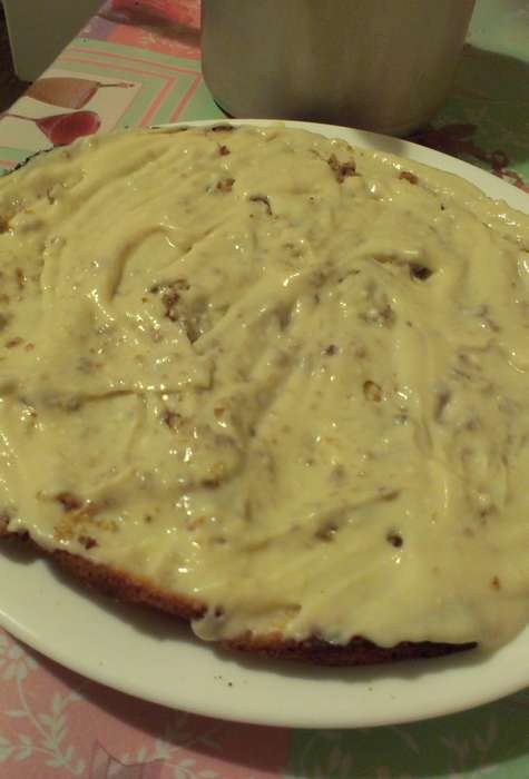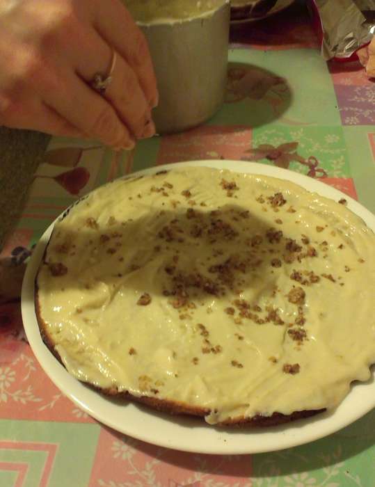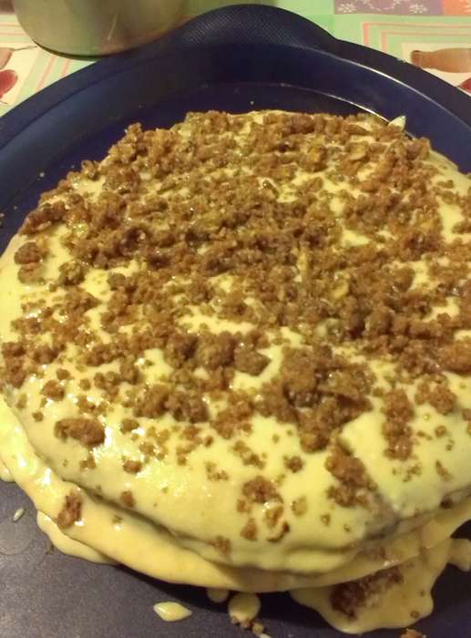 Готовый корж разрезаем напополам, смазываем кремом и посыпать грильяжем.