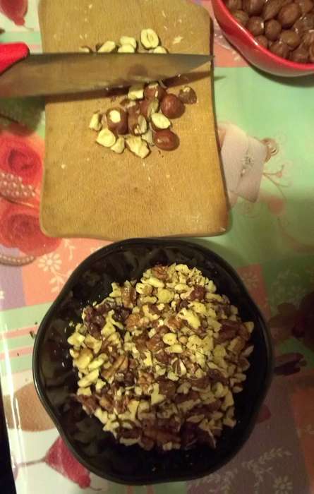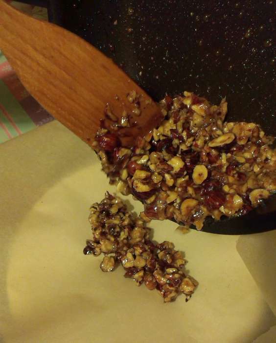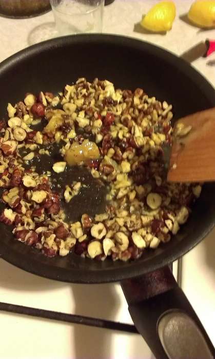 Для приготовления грильяжа нам нужно измельчить орехи., далее их поджариваем на сковороде быстро помешивая, чтоб не пригорели. Добавить мед, сок одного лимона и немного воды. Как только все закарамелизуется, выкладываем грильяж на пергамент, ставим его остужаться.