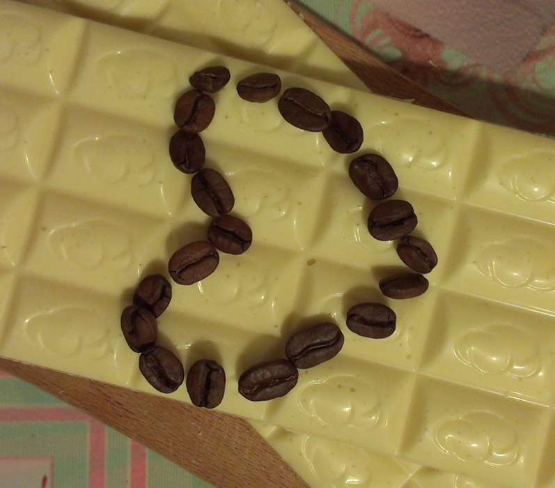Ленточку приклеиваем в центр белого сердца, по его каемочке аккуратно приклеиваем зерна кофе, даем открытке высохнуть. Подписываем.
