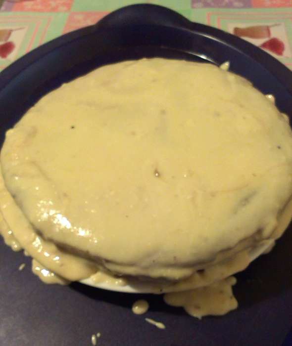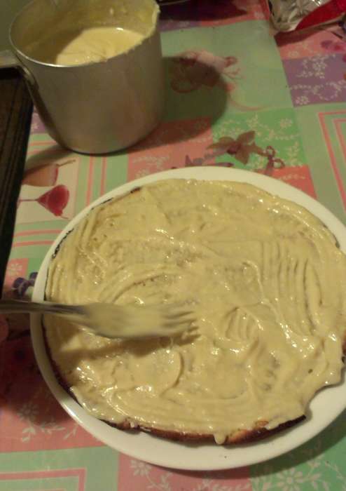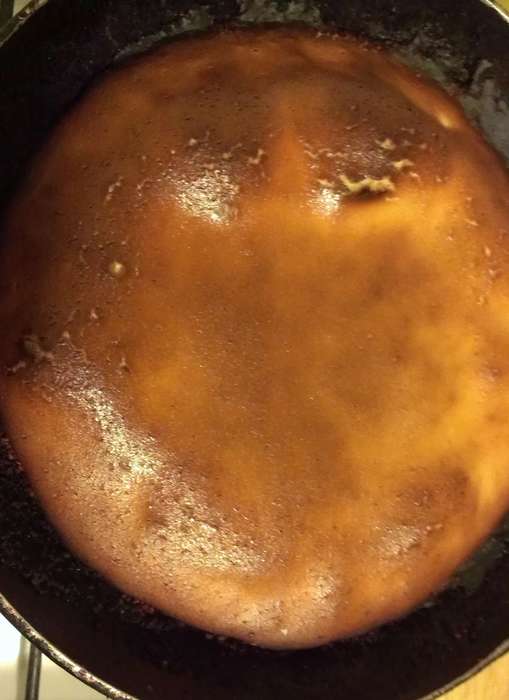 Разогреваем духовку до 170 С. Заранее приготовленную чугунную сковородку (или форму для выпекания) обмазываем сливочным маслом, посыпаем панировочными сухаряи (или мукой). Тесто перелить в форму. Коржи выпекаются примерно 30 минут.