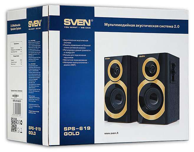 Глянцевая белая коробка со стилизованным синим крестом и золотистой надписью SVEN, намекает на финские корни фирмы. Внутри мы находим, естественно, руководство по эксплуатации и гарантийный талон на 12 месяцев с даты продажи. Кроме этого, непосредственно, сами колонки — активная и пассивная.