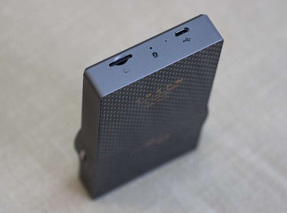 На верхнем торце легко находятся: подключение для наушников, линейный выход, коаксиальный, и кнопка включения/выключения плеера. На нижнем — разъем для подключения кабеля MicroUSB, слот для карты памяти MicroSD, и отверстие для экстренной перезагрузки устройства (reset).