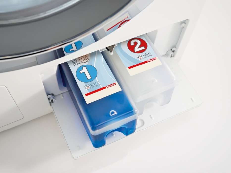 TwinDos действует в два этапа: сначала моющее средство Miele UltraPhase 1 удаляет жировые и белковые загрязнения, а затем второе моющее средство Miele UltraPhase 2 переходит к воздействию на стойкие пятна, например от красного вина или кофе. Количество используемого средства в каждом конкретном случае зависит от типа и количества белья.