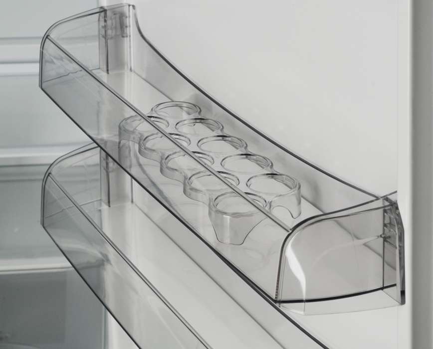 На двери расположены 4 прозрачные емкости на всю ширину панели. В комплектацию входит лоток для яиц (на 10 штук) и форма для производства льда.