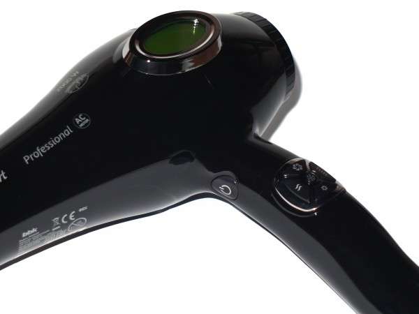 С торца на ручке прямо под указательным пальцем располагается кнопка включения, а панель управления находится рядом с большим пальцем (в том случае, если вы держите фен правой рукой).
