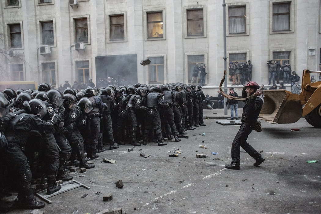 01.12.2013. Участник акции сторонников евроинтеграции Украины перед строем сотрудников правоохранительных органов во время беспорядков возле здания Администрации президента Украины на Банковой улице в Киеве.