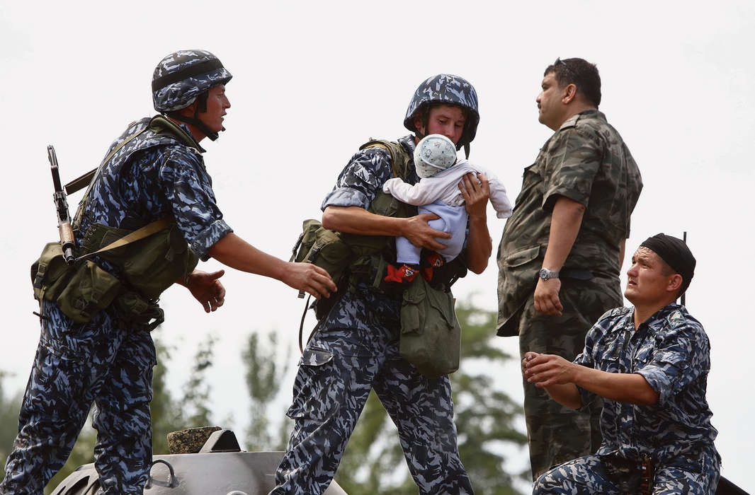 12.06.2010. Узбекский спецназовец передает ребенка. Беженцам из города Ош помогают перейти границу с Узбекистаном в нескольких километрах от города.