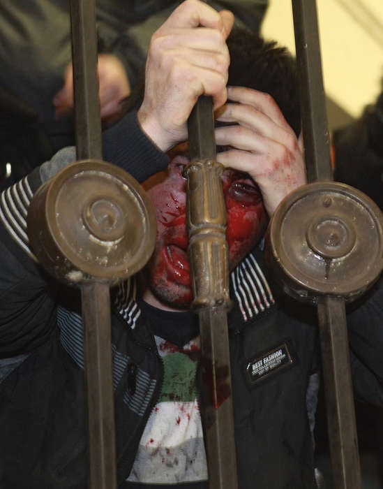 11.12.2010. Окровавленный участник акции в память об убитом фанате «Спартака» Егоре Свиридове в вестибюле станции метро