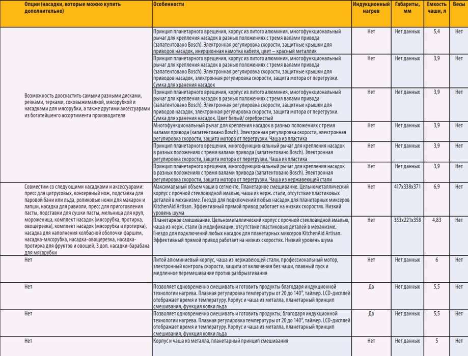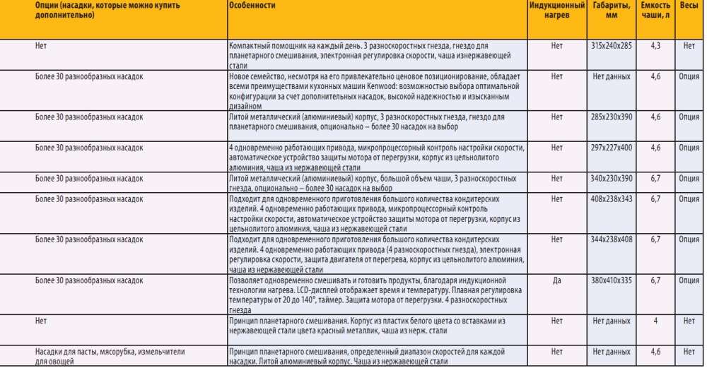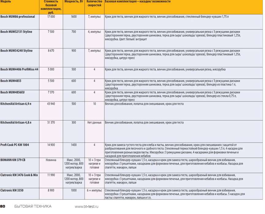 Рынок этих приборов в нашей стране очень узок, не более 30 моделей (и модификаций), большинство из них мы собрали в таблице. Отрадно, что выбор все же есть: от дорогих модификаций Kenwood и KitchenAid до более демократичных Bomann, Clatronic, Moulinex и Russel Hobbs.